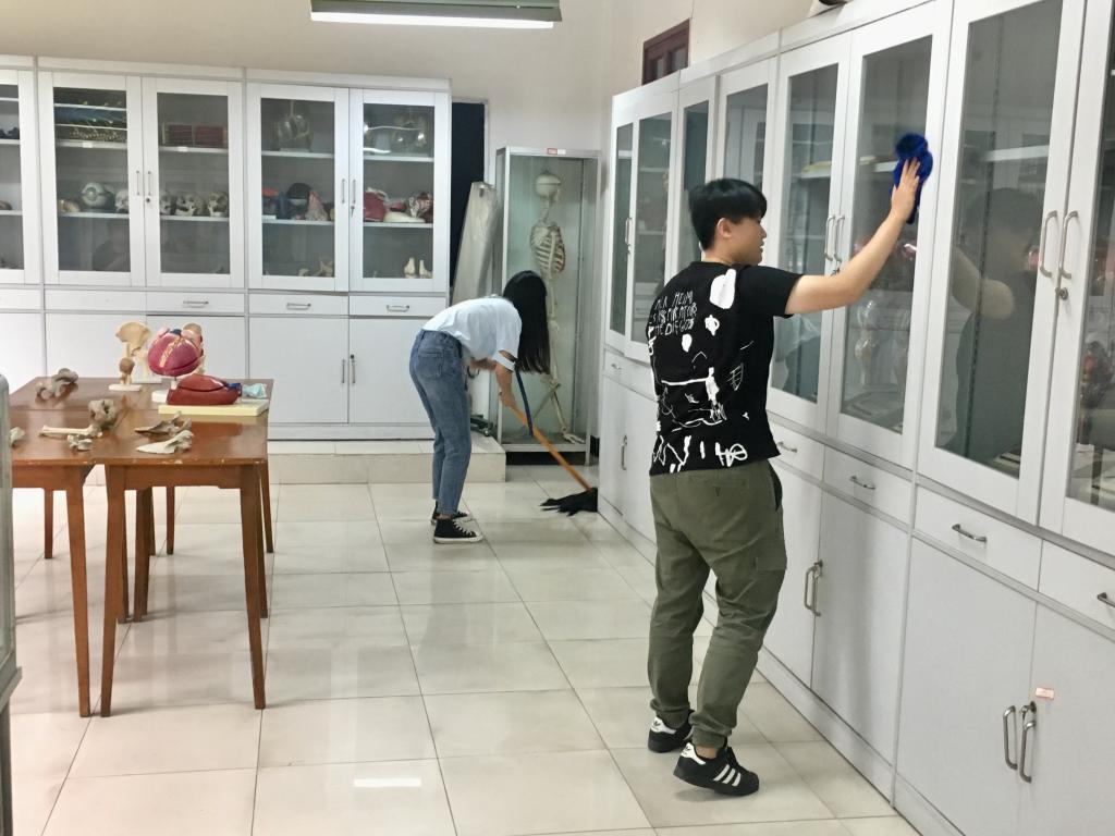 参加此次志愿服务活动的拟发展对象共20名同学,在活动中,来自不同支部的同学们分工合作,积极配合,互帮互助,重点清扫实验室的卫生死角,擦洗地板桌子。活动当日虽然天气炎热,可是丝毫没有影响大家的积极性,楼道里随处可见同学们忙碌的身影。