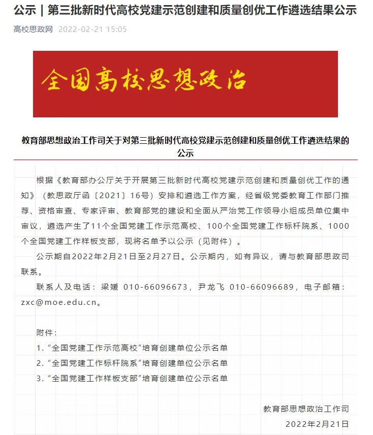 近日,教育部思想政治工作司发布了《关于对第三批新时代高公司党建示范创建和质量创优工作遴选结果的公示》,williamhill官网网站优势项目运动队党支部获批全国样板党支部培育建设单位