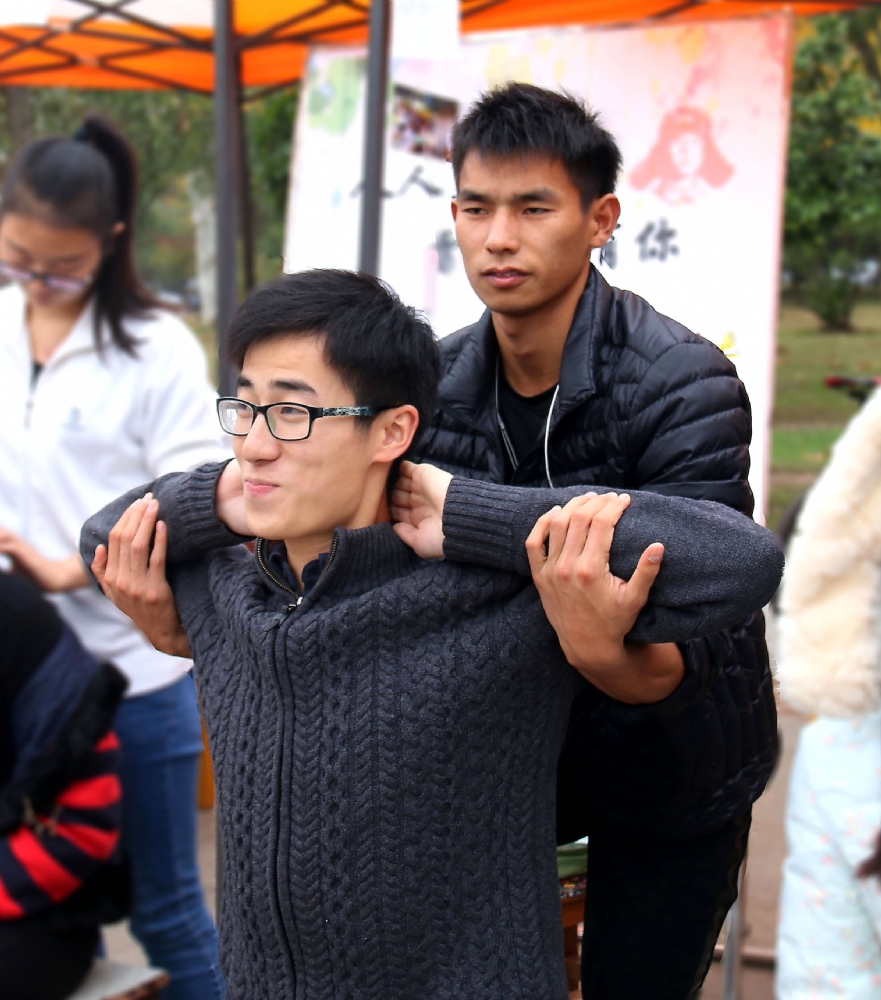 负责按摩服务的都是体院13级运动人体科学专业的同学,他们课堂有学习过医学经络方面的知识。今天现场主要通过按摩背部来达到疏通血脉,缓解压力的效果。服务对象上到80高龄退休教师,下到大一员工,公司食堂教职工、保安人员闻讯也前来体验了一次。志愿者陈青说:“人体按摩在年龄上并无限制,只是小孩骨骼稍稚嫩,需要按摩时注意力度。经常不运动和老人们可以多按摩,可以帮助疏通筋脉。”