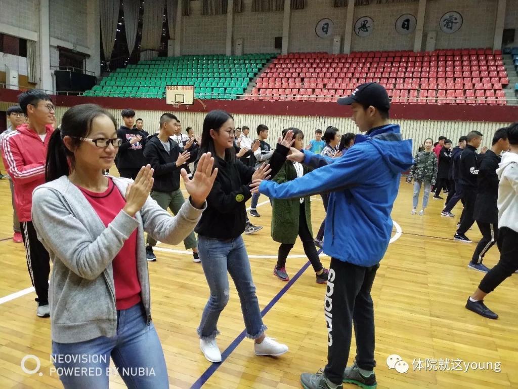 在整个太极拳的训练中,有一这样一支队伍用自己的热情,一拳一拳击打出秋季武汉的火热。太极之柔美,拳之刚烈、刚柔并进,书写我体院青年的潇洒帅气。