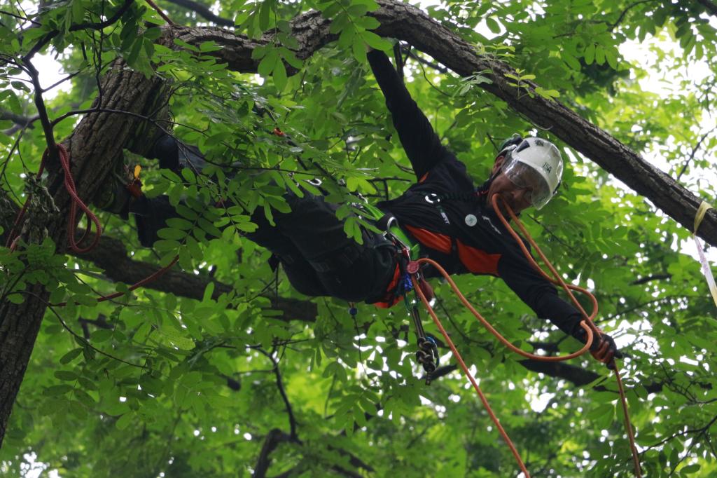 工作攀爬测试选手使用绳索、安全带等装备在树上移动的能力。本次参赛者须从树上的出发点开始,行走树上 5个工作站,并在每个工作位置执行不同的指定任务。 每个工作站都设置了一个响铃,而参赛者必须敲过响铃才可继续前往下一站。 5 个工作站包括了手锯、枝条投掷、高枝剪、行走枝干及着地五种工作任务,最终来自河南的刘育新,赢得了“工作攀爬”项目男子比赛的第一名,刘育新今年51岁了,是本次参赛中年龄最大的选手,他直言自己虽然体力可能不如年轻人,但经验更为丰富,“小时候我就是爬树高手,现在也经常练习!”他自信地表示,“我未必输给年轻人。”