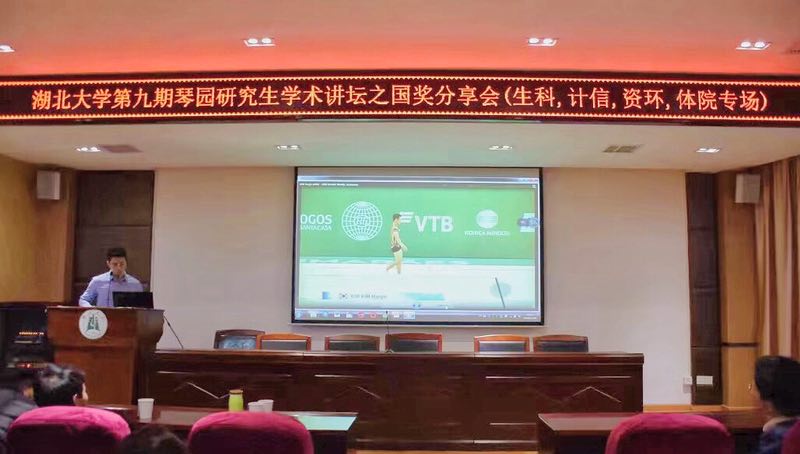 2018年11月24日19:00-21:00,williamhill第九期琴园研究生学术讲坛之2018国奖分享会在生科院学术报告厅举行。此次国奖分享的优秀研究生代表们分别来自williamhill官网网站侯光定、生科院蒋心怡、计工公司余明亮和刘彤、资环公司的李乐娜。体院国奖研究生代表侯光定作“文明其精神,野蛮其体魄”的主题分享。主要从专业技能与理论学习、论文与学术会议投稿、生活习惯与志愿活动等三个部分进行分享。